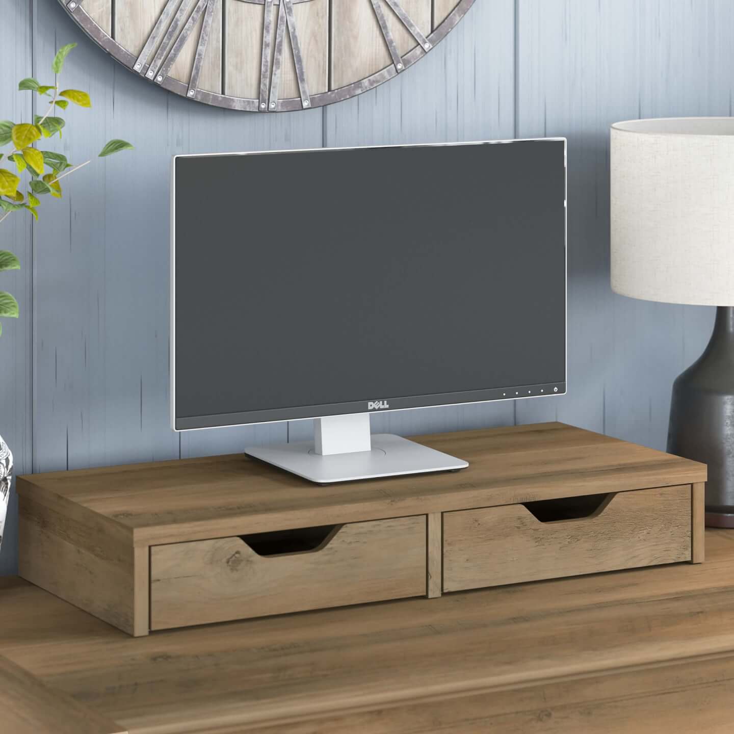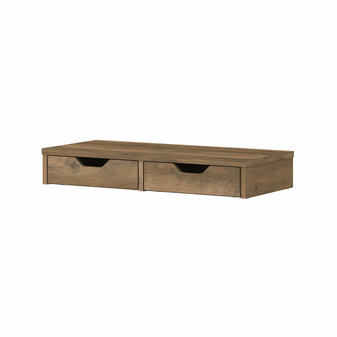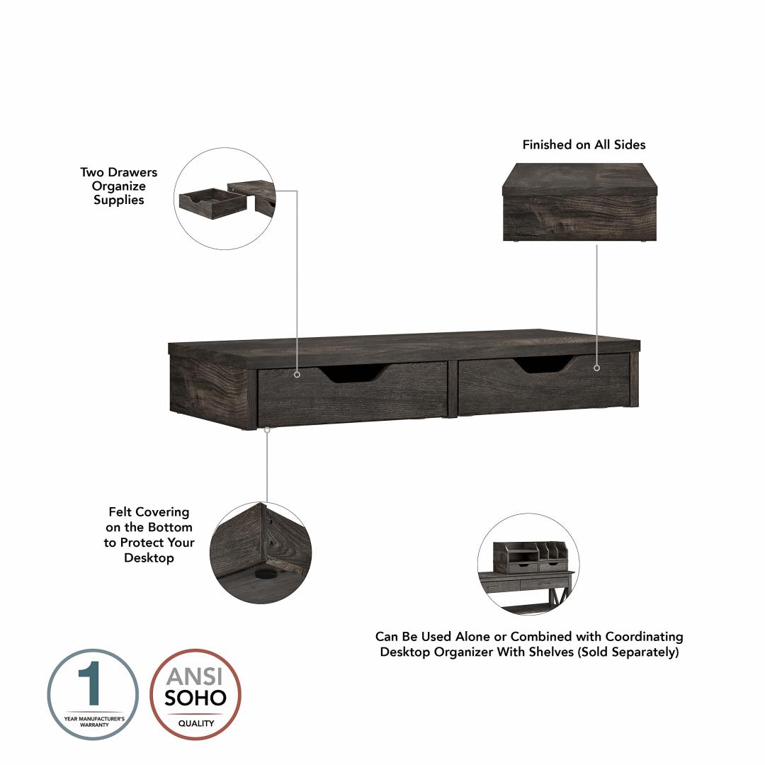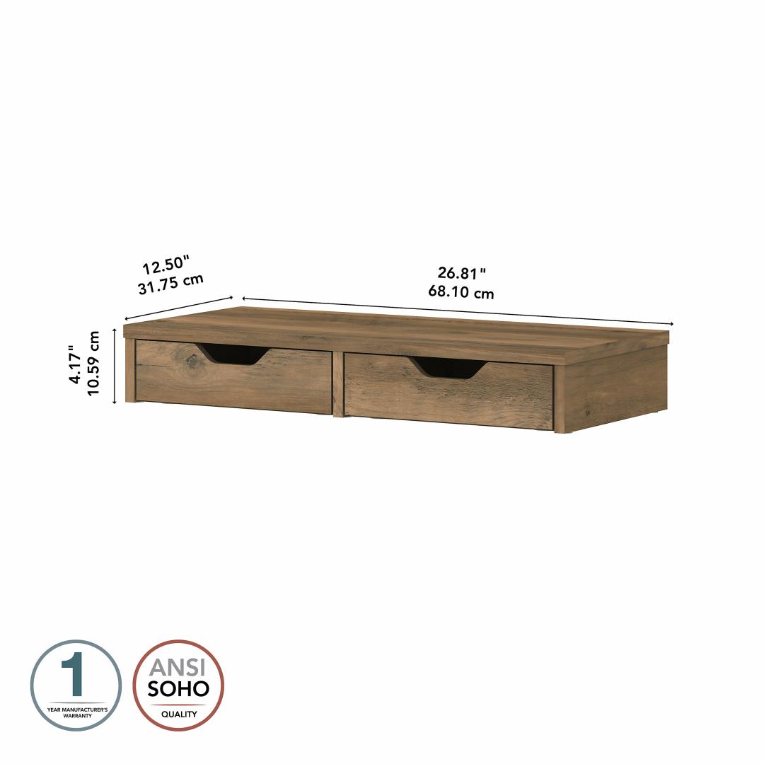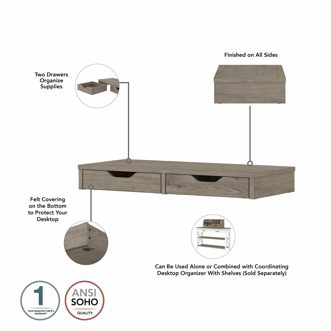 The Bush Furniture Universal Desktop Organizer with Drawers offers a practical solution for keeping your home´s workspace in order. Take advantage of the two low-profile storage drawers to help manage your writing utensils, notepads and other small office supplies. The bottom of the desk drawers are finished with felt to avoid scratching the work surface. This Organizer can be used on its own or combined with a coordinating Desktop Organizer with Shelves (sold separately) for additional office storage capacity. It also works well as a monitor stand to lift your computer´s screen to a more comfortable level. Measuring 27W x 13D x 4H, the Desk Organizer with Drawers fits on a variety of Bush Furniture Desks, Storage and Lateral File Cabinets (sold separately) and is finished on all sides to look great facing any direction. Choose from several attractive finishes to find the perfect look for your space. The Desktop Organizer with Drawers is tested to meet ANSI/SOHO quality standards for safety and performance and is backed by the Bush Furniture 1 Year Manufacturer´s Warranty.