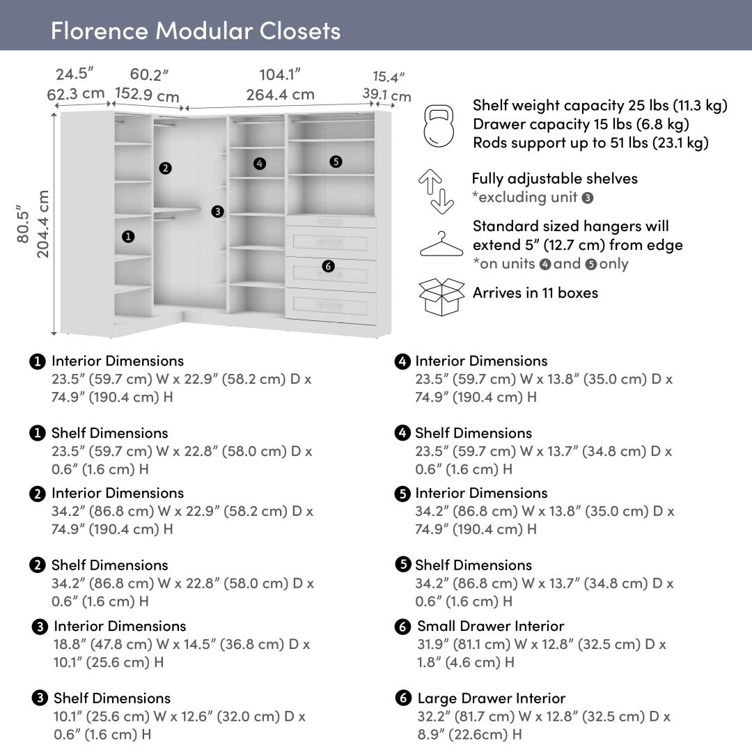 Modular L-Shaped Closet System with Shelves, Drawers, Clothing Rods & LED Lights, Shaker Style, 105W x 61D