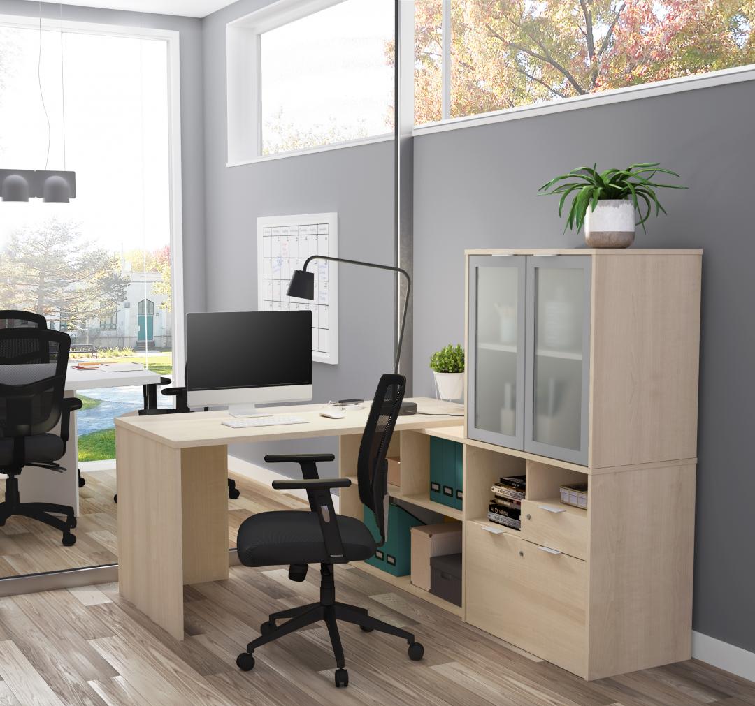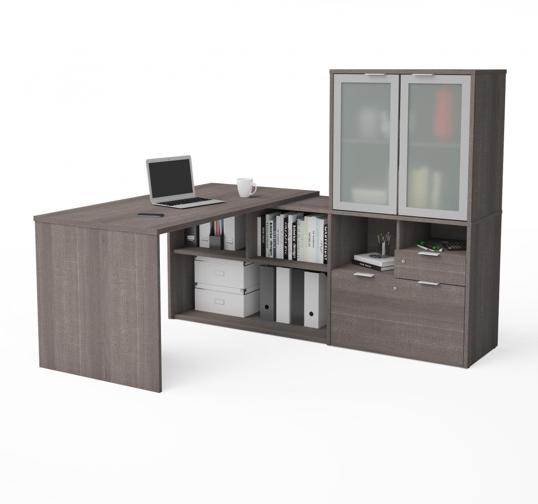 72W L-Shaped Desk with Frosted Glass Door Hutch
